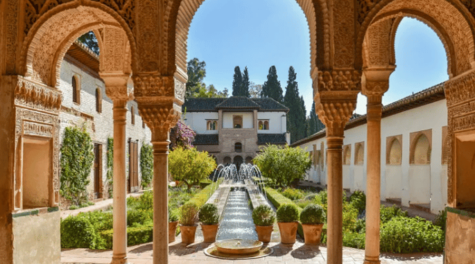 Perched above Granada, the Alhambra is one of Spain’s most celebrated examples of Islamic architecture. Built by the Nasrid dynasty in the 13th century, the sprawling complex blends fortified walls, ornate palaces, and lush gardens. Its detailed stucco carvings, patterned tiles, and Arabic calligraphy showcase incredible Moorish craftsmanship. Later additions, like a Renaissance-style palace, reflect the Christian influences that followed.